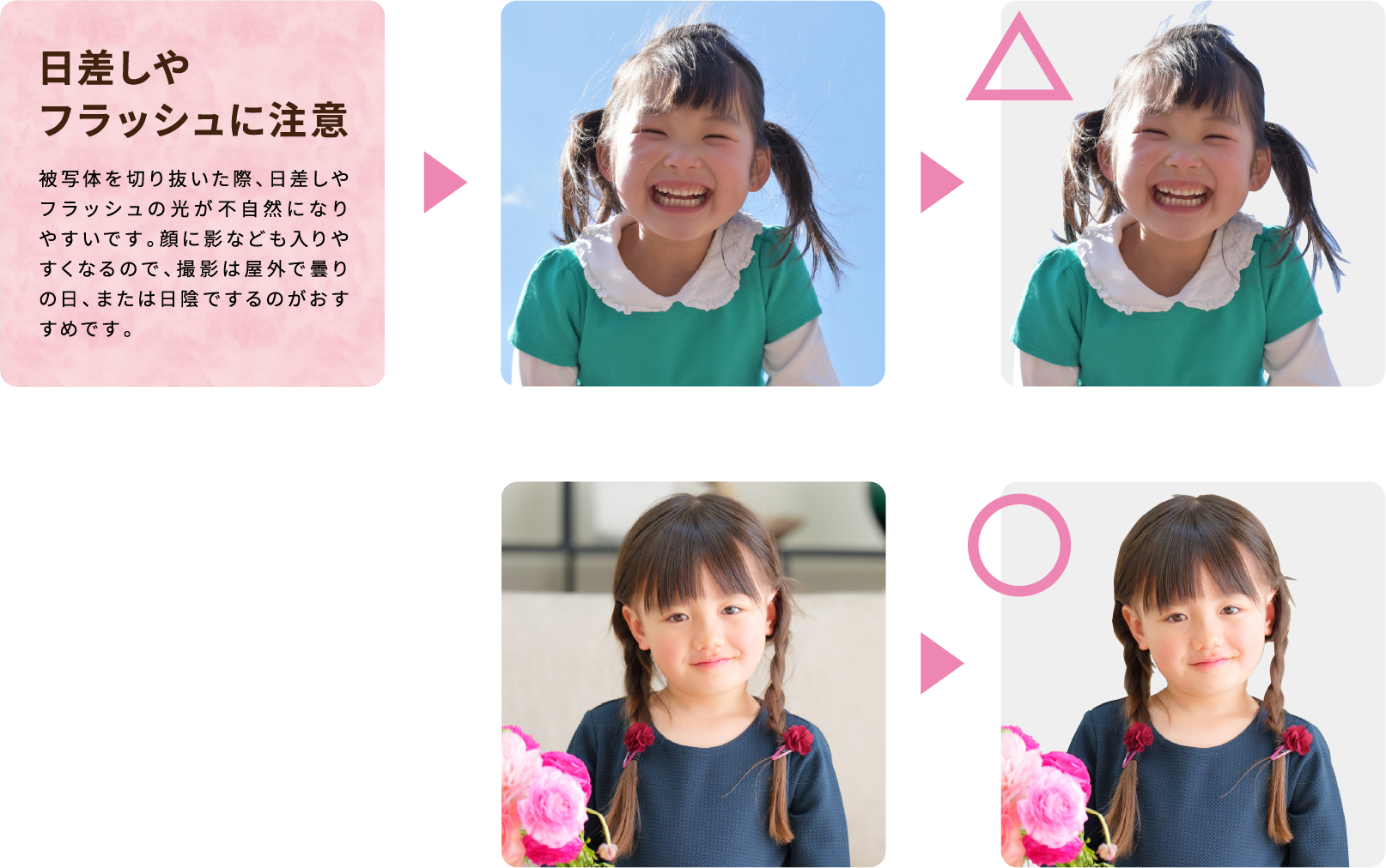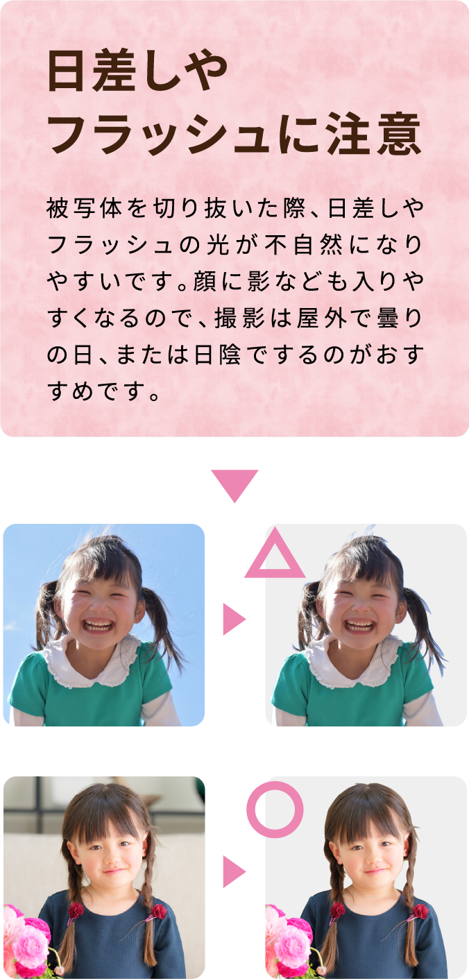 ●撮影は天気の良い日の日陰、または曇りの日に行うと、顔などに影ができにくく自然な光で撮影が行えます。