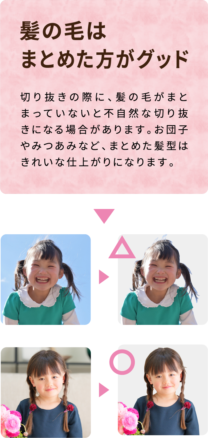 ●髪の毛はできる限りまとまっている方がキレイに切り抜きができます。